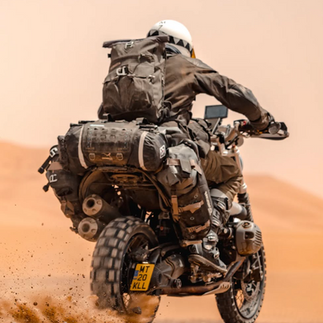 This is my main luggage solution when touring solo and is a lot more practical than just strapping a load of bags to the bike as there are many pockets so you can put an oil canister and tools on one side, a water bottle in the other etc. I've expanded it with 2 extra pockets on the sides which fit a 1 litre fuel bottle, water bottle or more importantly a bottle of wine. That gives me 4 side pockets, 2 side 16 litre waterproof rolltop bags and the rear 8 litre rolltop bag. The beavertail lets you strap things like jackets underneath it. You can replace the 8l tailbag with a 22l one or use your own bag. When you arrive at your hotel you can quickly just pull out the 3 rolltop bags and bring them to your room. There's enough space for a long tour when staying in hotels or a weekend camp. For longer distance camping I'd look at the larger Reckless 80 system.